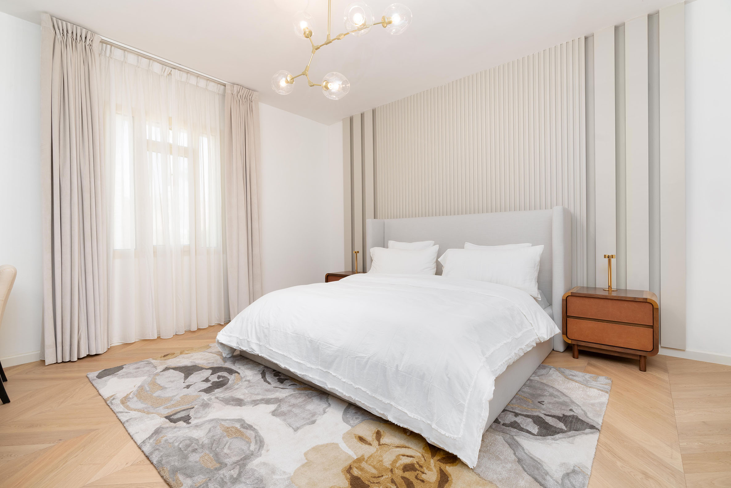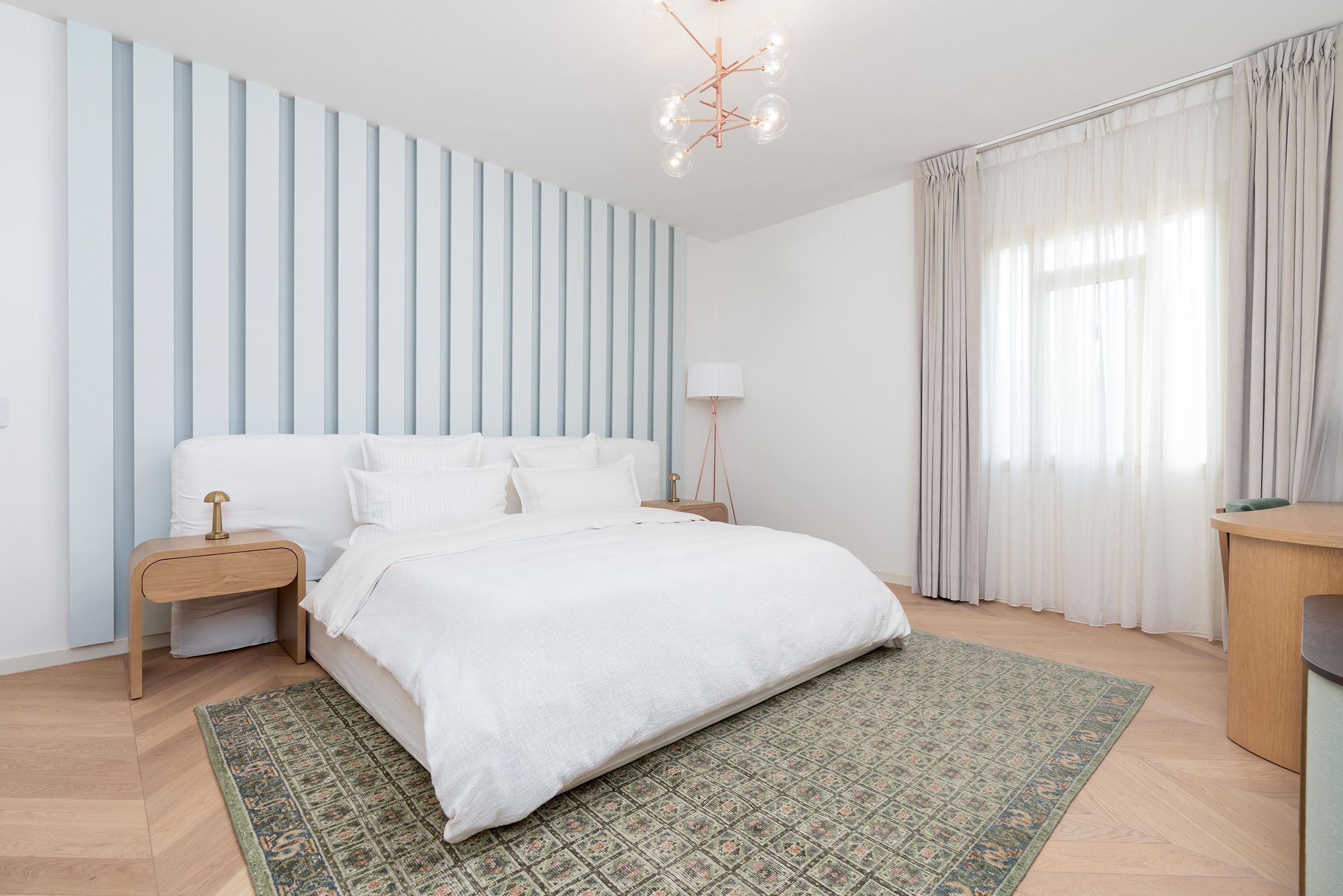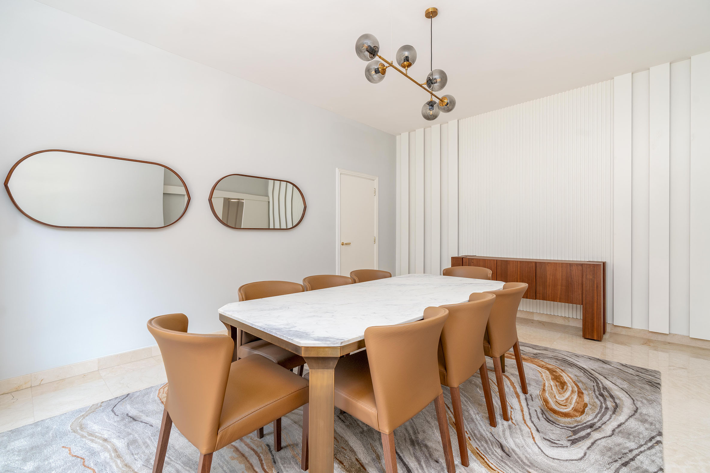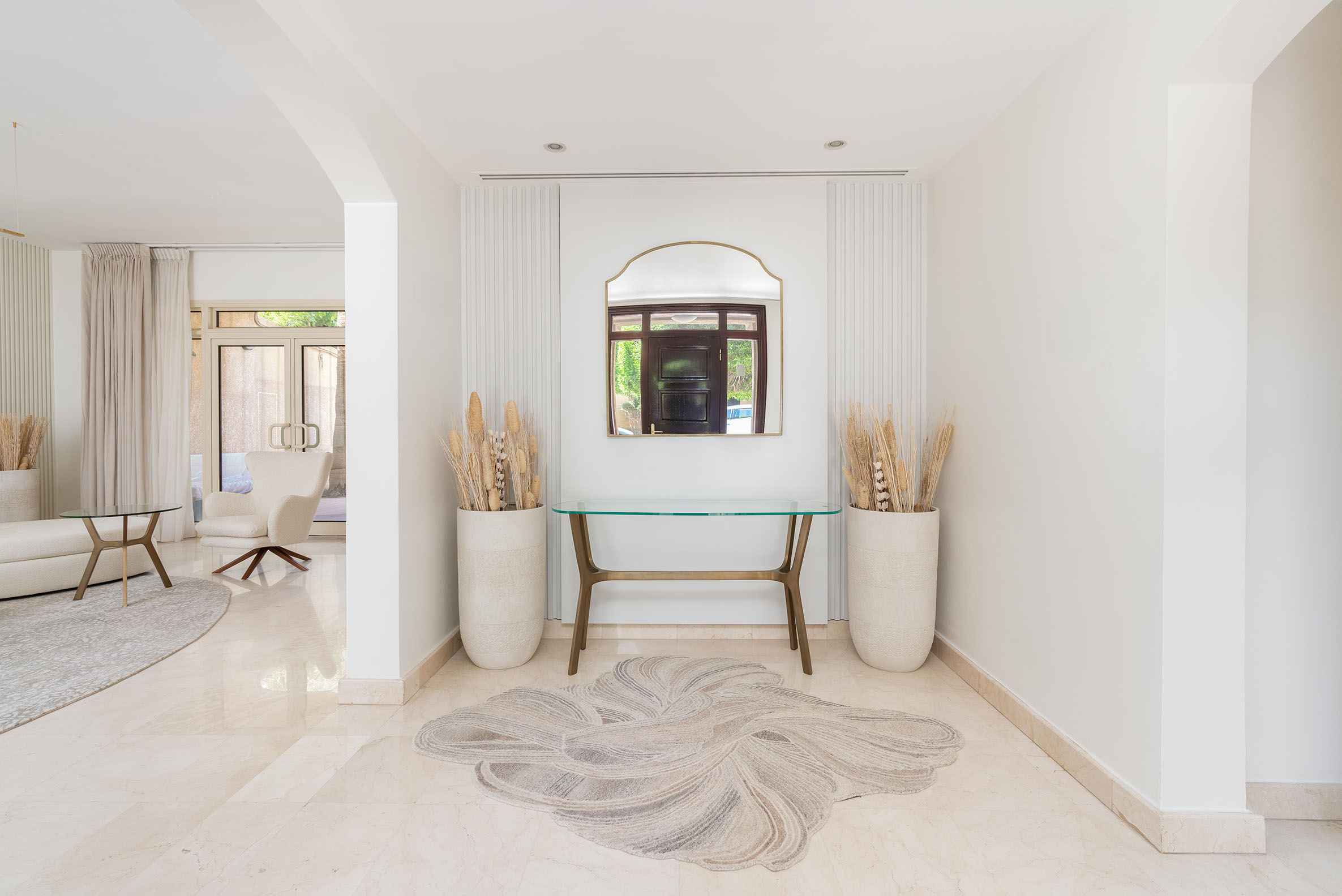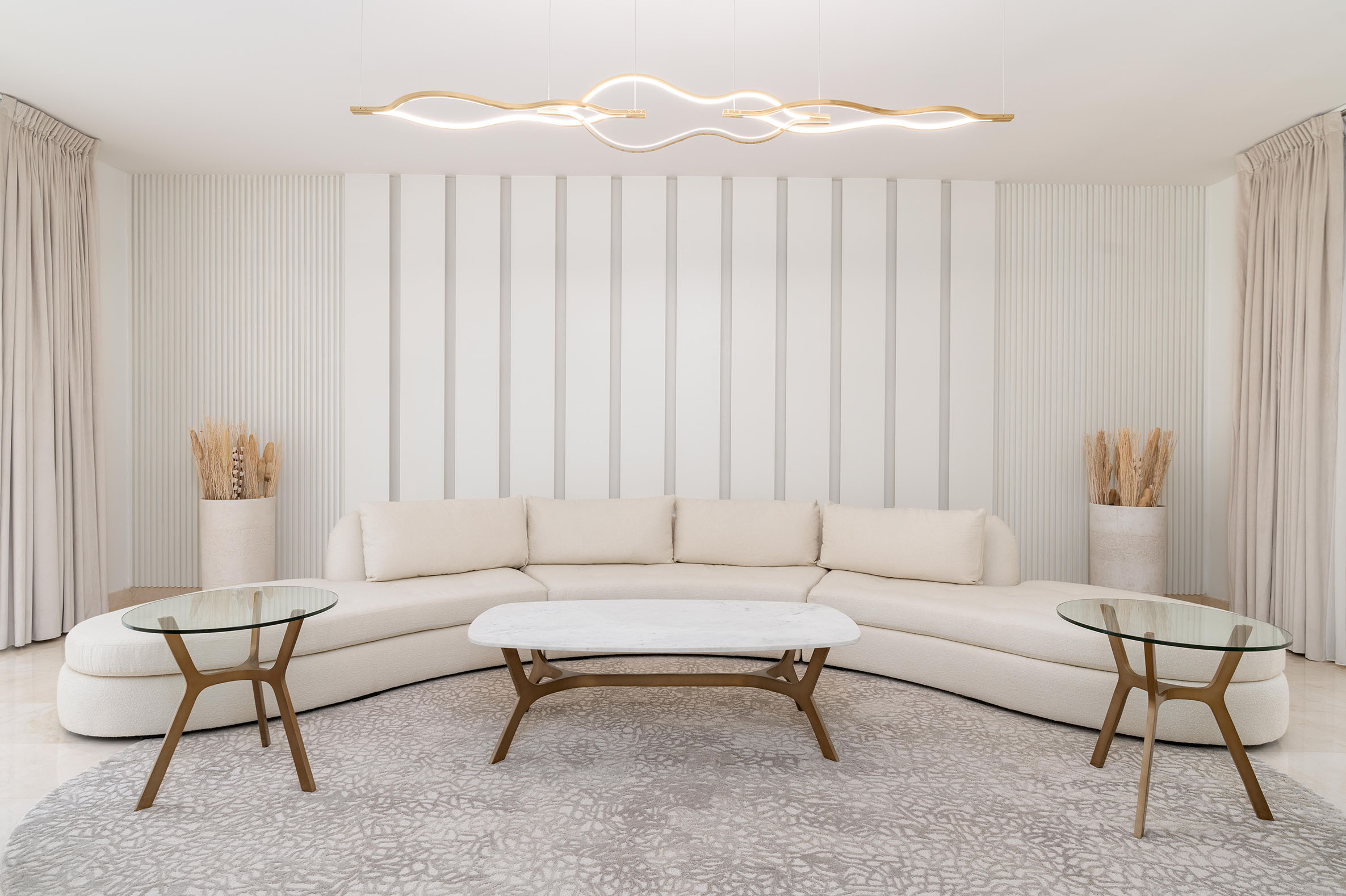 Innova designed this villa using a warm and bright palette that creates inviting and cozy rooms. Patterned lines on the walls complement the delicate selection of furniture, lighting features, and rugs, enhancing the overall ambiance and creating a harmonious, welcoming atmosphere.